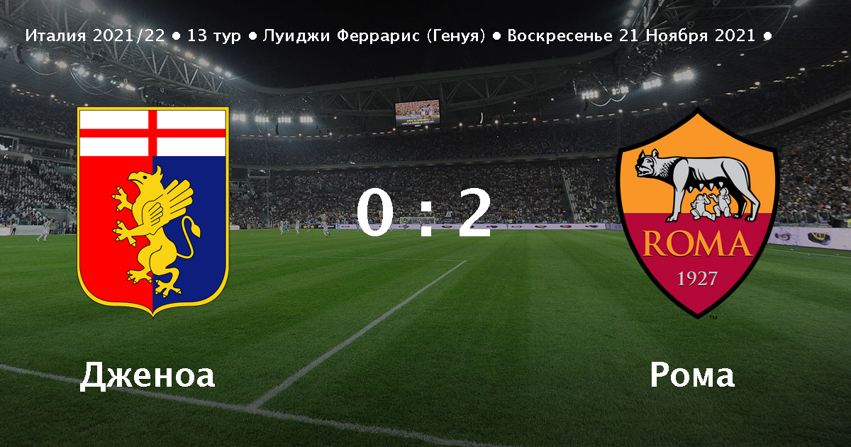 Получите доступ к бесплатным трансляциям и начните заключать пари уже сегодня. Рома обыграла в гостях Дженоа в матче 13-го тура чемпионата Италии 20. Составы команд статистика протокол матча между командами Рома и Дженоа 21112021 на Soccerru. Перед Дженоа стоит задача обойти соперника и покинуть зону вылета а мы подготовили прогноз на этот матч против.